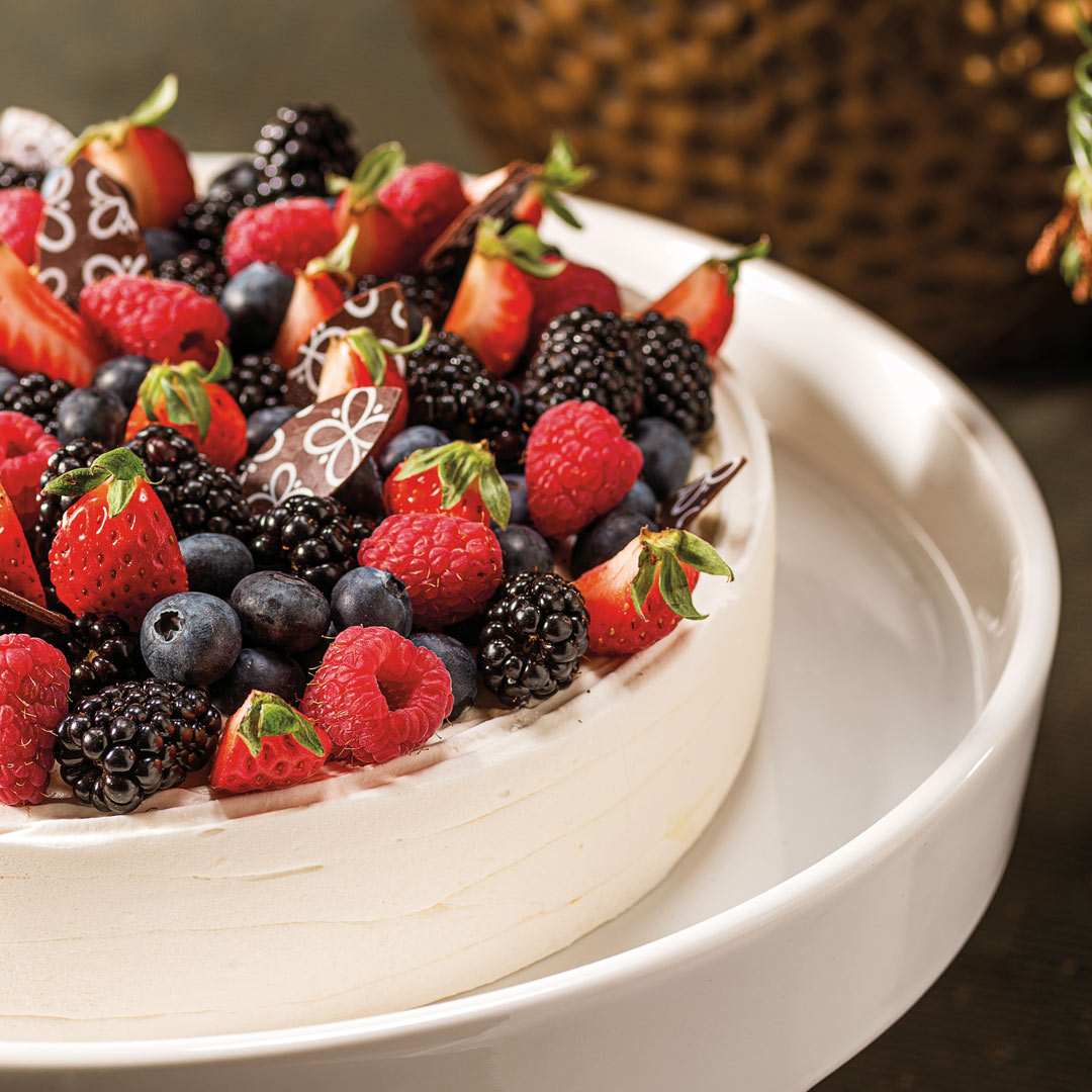 A Pavlova é um disco de suspiro recheado com creme especial de chantily com frutas vermelhas. Coberto com frutas vermelhas frescas.