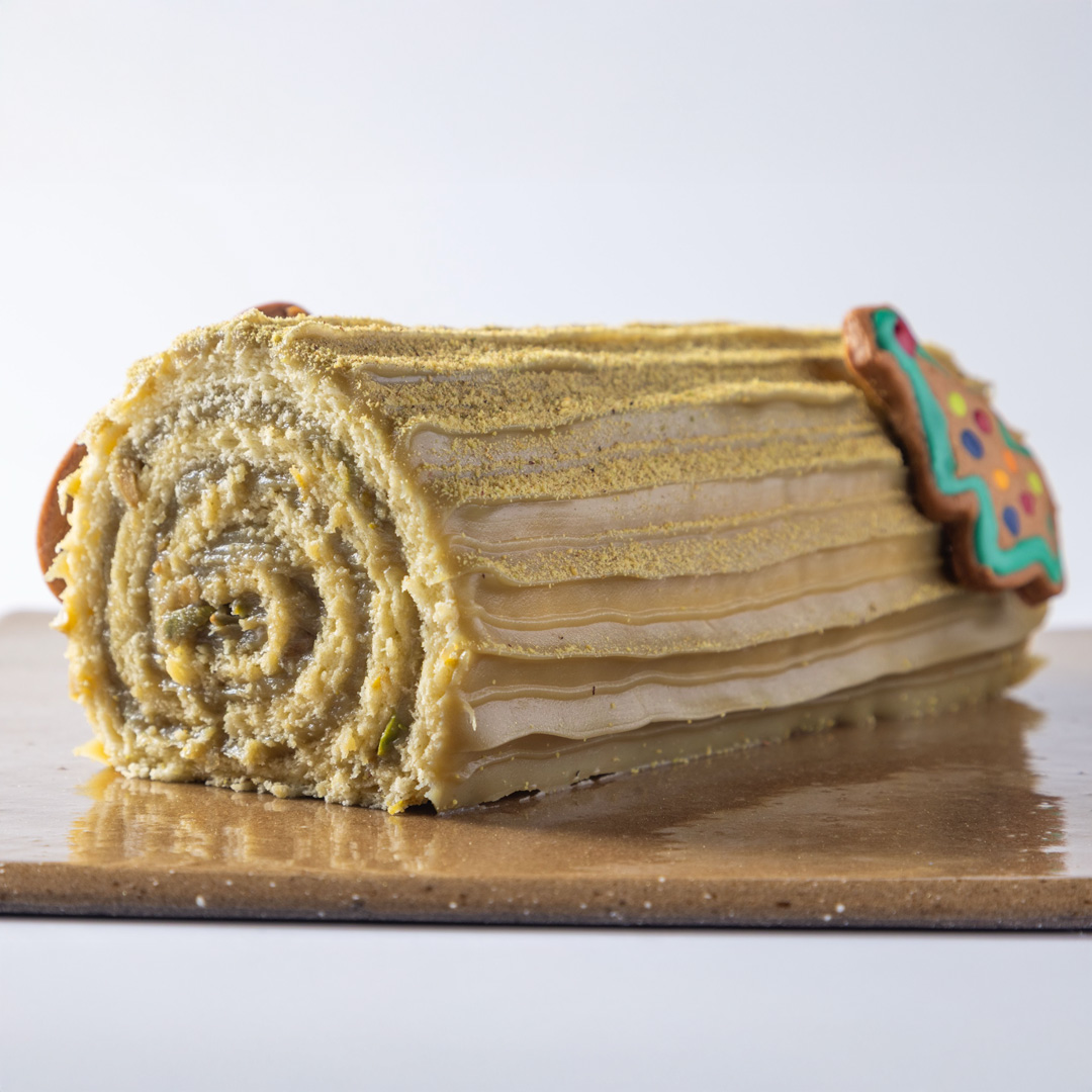 Rocambole de massa leve, recheado e coberto com brigadeiro cremoso de pistache. Finalizado com biscoitos de gingerbread — tradicionais biscoitos aromáticos feitos com gengibre, canela e outras especiarias quentes, que trazem um toque festivo ao doce.