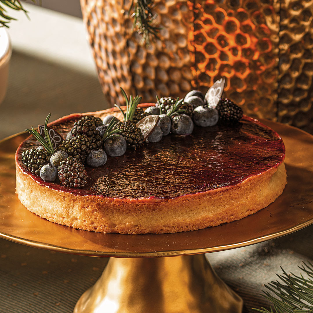 Torta de massa doce, coberta por uma fina camada de creme de amêndoas, recheada com creme de limão siciliano e geleia artesanal de mirtilo e amora. Finalizada com frutas frescas e um leve toque de alecrim.